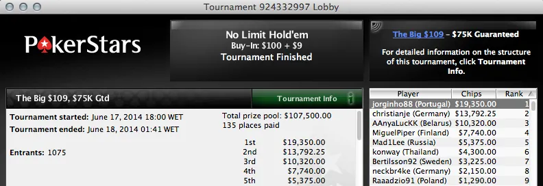 A noite de ontem trouxe alguns resultados interessantes para os jogadores lusos no poker online. O maior prémio foi alcançado por Jorge Abreu no The Big $109 da PokerStars.