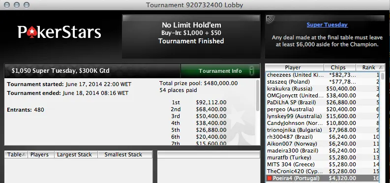 Com uma deep run no Super Tuesday, Carlos "tacuara" Branco volta a mostrar serviço nos panos digitais da PokerStars, o 16º lugar no major da casa da espada vermelha rendeu $4,320.