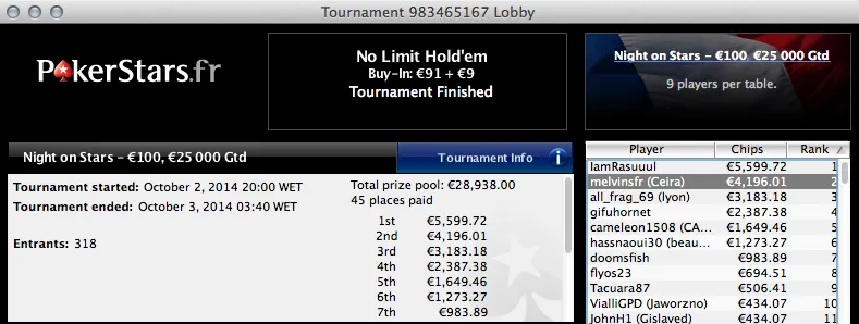 O luso venceu o The Big $22 e juntou mais $10,148 à sua conta da PokerStars. Na Star.FR, Melvins foi segundo no PokerStars.FR Night on Stars - €100, €25 000 Gtd e até Coimbra voaram mais $5,310.87. De salientar também a presença de Carlos "Tacuara" Branco na mesa final do mesmo torneio.