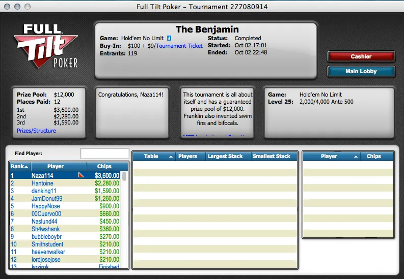 No The Hot $44, mrlabios foi 3º e amealhou mais $4,718. Por fim, e na Full Tilt Poker, João "Naza114" Vieira venceu o The Benjamin ($3,600).