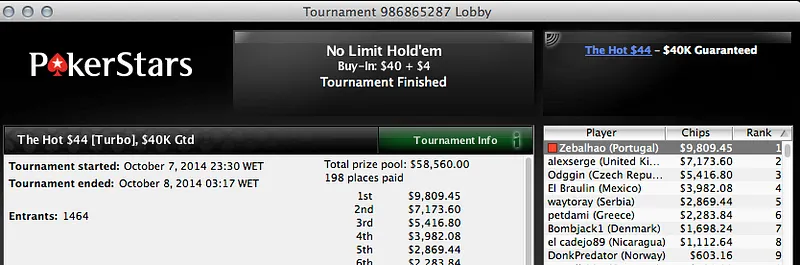 O nosso conhecido Zebalhão começou por ficar em 2º ($4,031) no $55 NL Hold'em [Turbo,2x Chance], $15K Gtd da PokerStars, venceu o The Hot $44 ($9,809.45) e terminou a noite com mais uma vitória num $22 NL Hold'em [1R1A], $15K Gtd ($4,605.73).