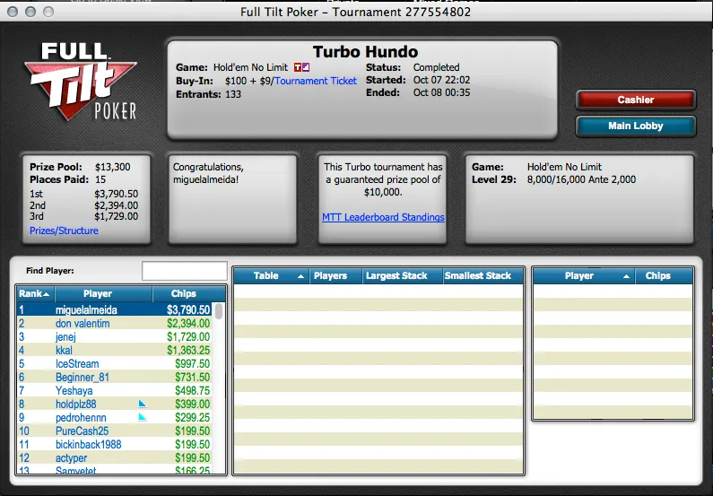Quem também obteve vitórias foram WinSmallPots e Miguel Almeida, o primeiro venceu o The Hot $109 ($4,472) da PokerStars e o segundo o Turbo Hundo ($3,790) da Full Tilt Poker .