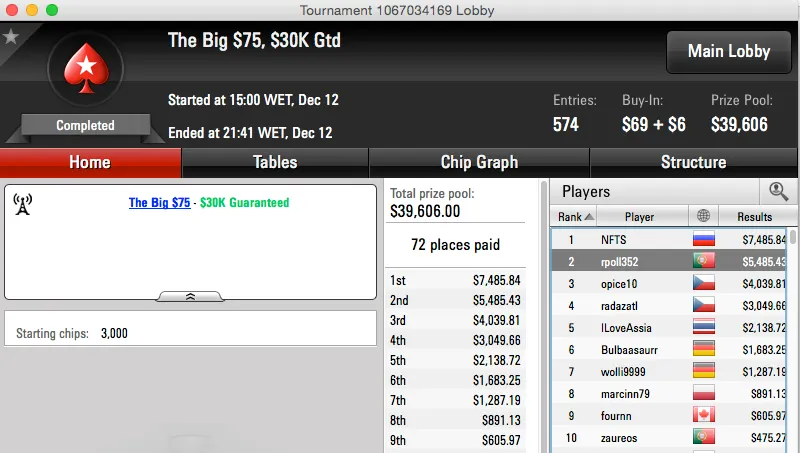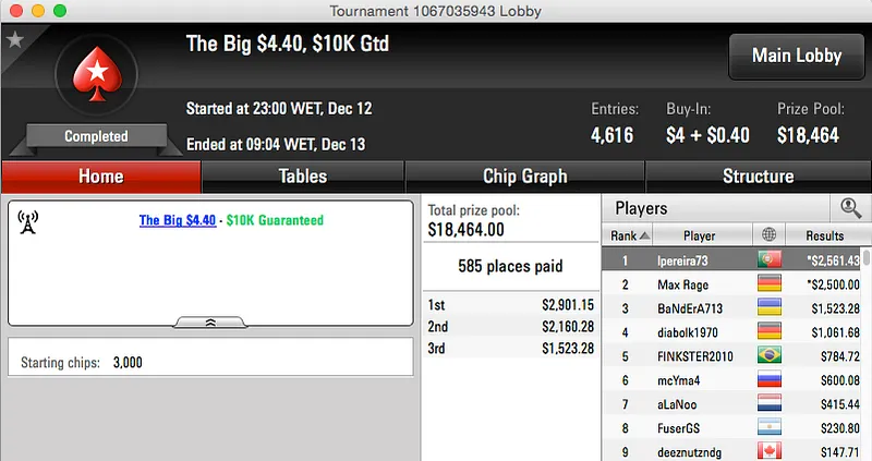 O Big $162 viu Nuno "SE7E" André ficar na sexta posição e garantir um prémio de $3,646, melhor fez lpereira73 que venceu o Big $4,40 e tem agora mais $2,561 na sua conta da PokerStars.