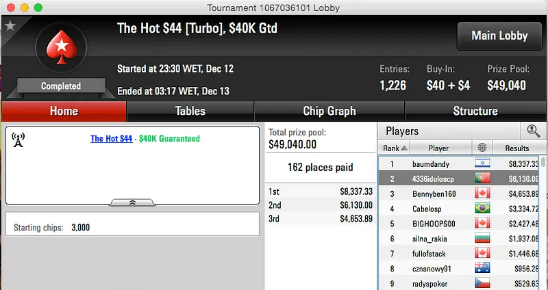 O maior resultado da noite foi alcançado por Afonso Ferro no Hot $44 da PokerStars. Afonso só perde no heads-up e garantiu um prémio de $6,130.