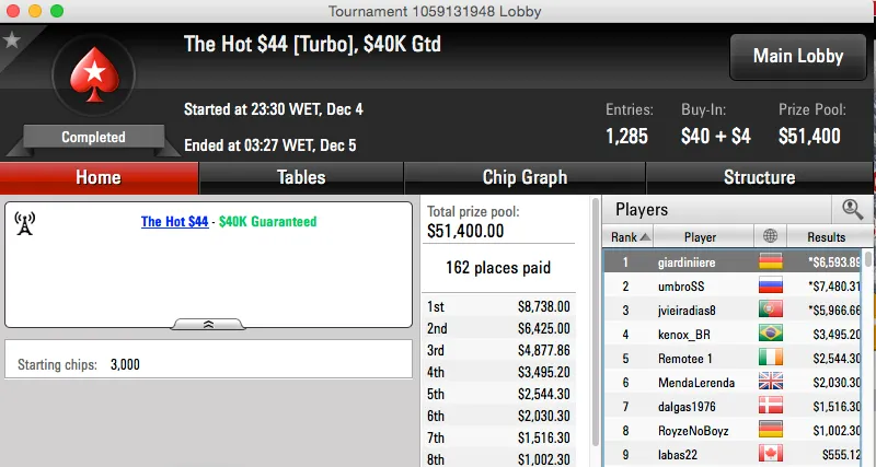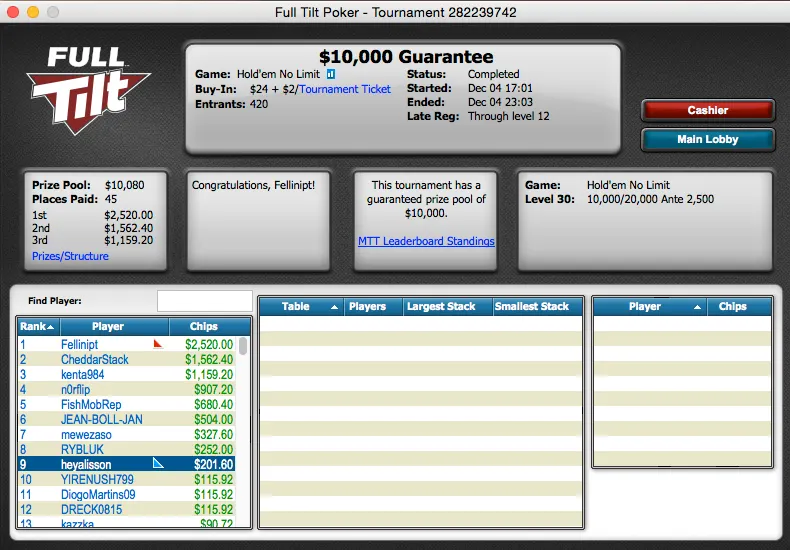 NaFull Tilt conseguimos apenas um resultado digno de registo e foi mesmo uma vitória. Nuno "Fellini33" Teixeira não deu hipóteses à concorrência e ganhou o$10,000 Garantidos, juntou mais $2,520 à sua banca.