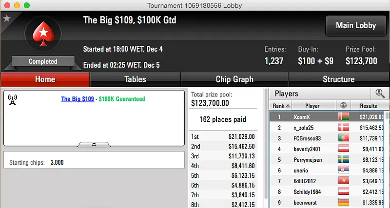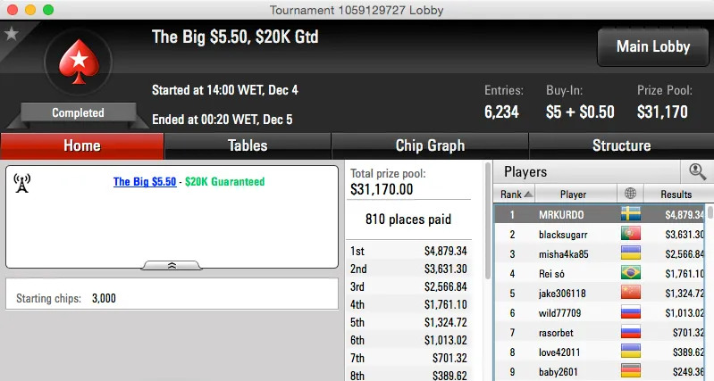 O maior prémio alcançado foi mesmo o terceiro posto de Ricardo Grosso no The Big $109 da PokerStars. Sem deal, Ricardo garantiu o lugar mais baixo do pódio e isso conferiu-lhe o direito a um prémio de $11,739.