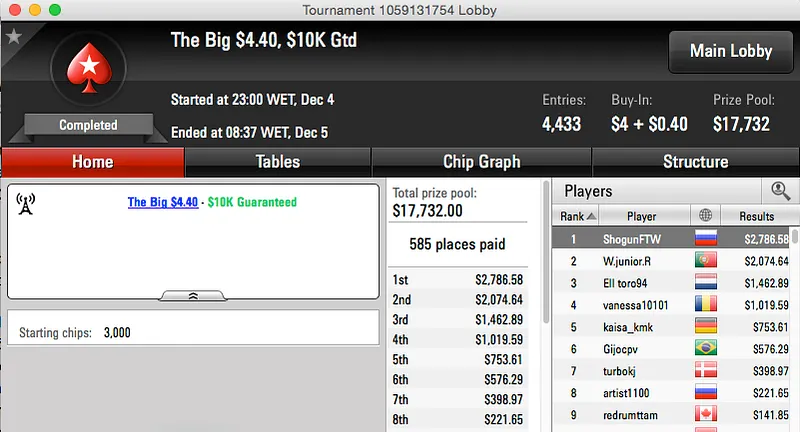 Por fim aparece o segundo lugar de W.junior.R no The Big $4,40 ($2,074).