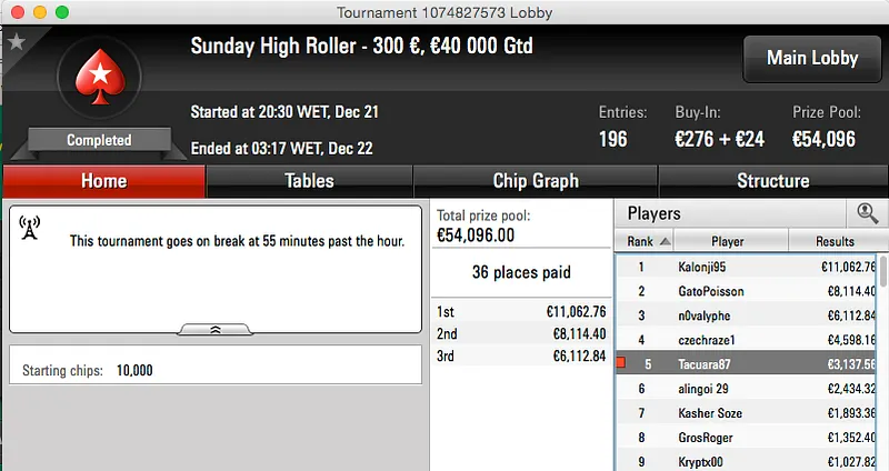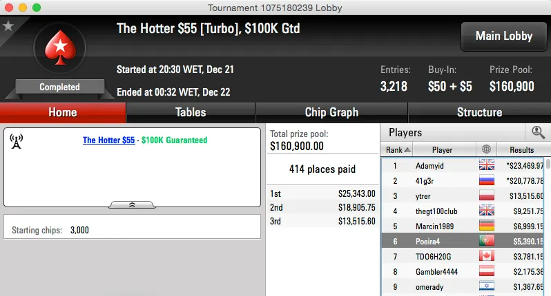 Por fim temos dois resultados de Carlos "Tacuara" Branco, um sexto no The Hotter $55 ($5,390) e um quinto lugar no Sunday High Roller da PokerStars.FR (€3,137).