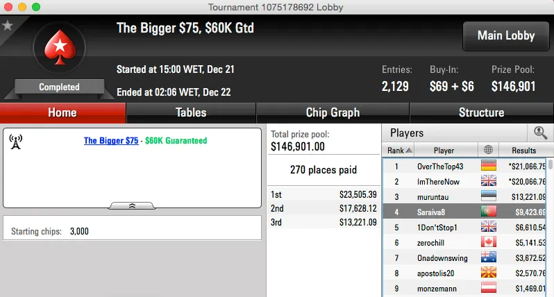 No The Bigger $75 os lusos voltaram a ter um representante na mesa final. iSaraiva8 ficou no quarto lugar e garantiu um prémio de $9,423.
