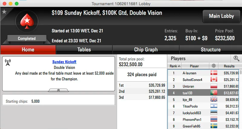Já tínhamos falado dele durante a semana e tua133 volta a estar em destaque, ficou no 4º lugar do Sunday Kickoff ($12,627).