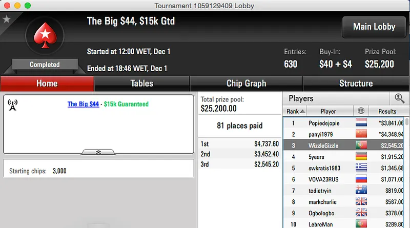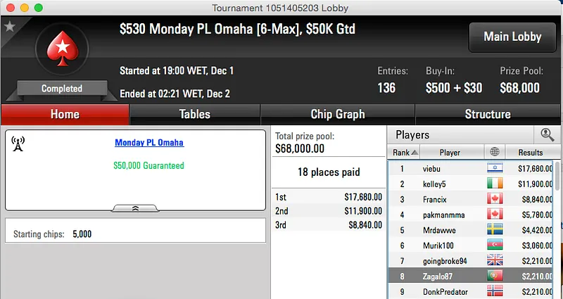 Em segundo aparece Luis Faria com a sua vitória no Big $33, também sem acordo. Faria bateu o inglês Jspagz e juntou $5,476 à sua banca.