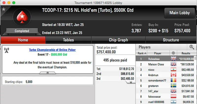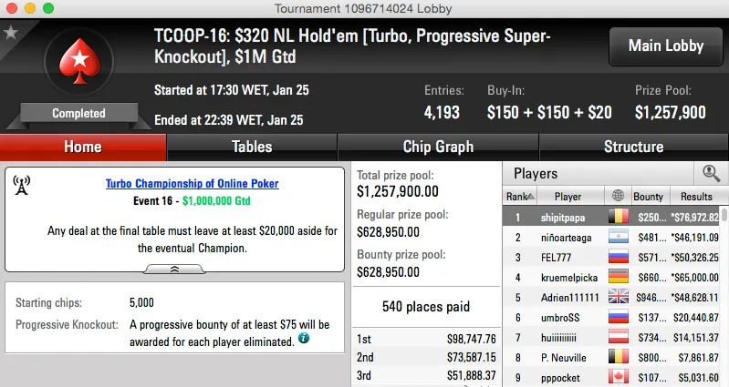 | 22 | $82.00 | TCOOP-22: $82 FL Omaha H/L [Turbo], $50K Gtd | 26 Jan | 12:00 | $50,000* | 1 |