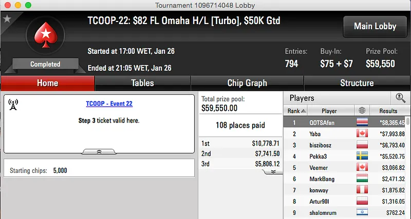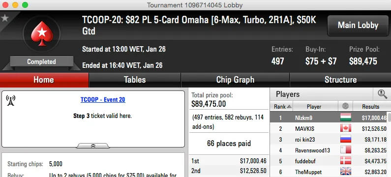 | 24 | $109.00 | TCOOP-24: $109 PL Omaha H/L [6-Max, Turbo], $100K Gtd | 27 Jan | 17:00 | $100,000* | 2 |