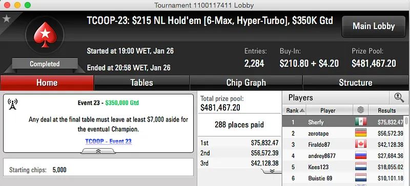 | 25 | $215.00 | TCOOP-25: $215 NL Hold'em [8-Max, Turbo], $500K Gtd | 27 Jan | 19:00 | $500,000* | 4 |
