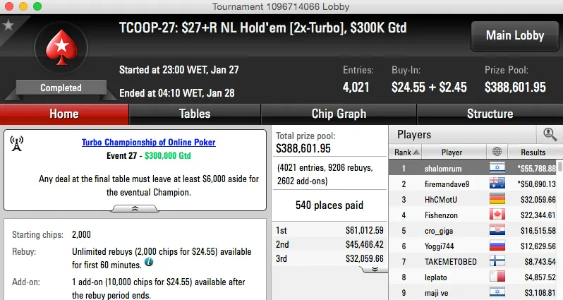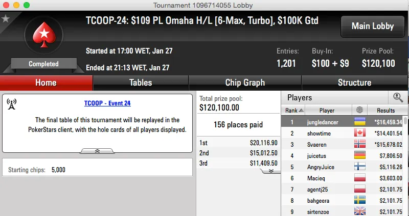 | 30 | $11.00 | TCOOP-30: $11+R PL Omaha [6-Max,3x-Turbo], $125K Gtd | 28 Jan | 12:00 | $125,000* | 2 |