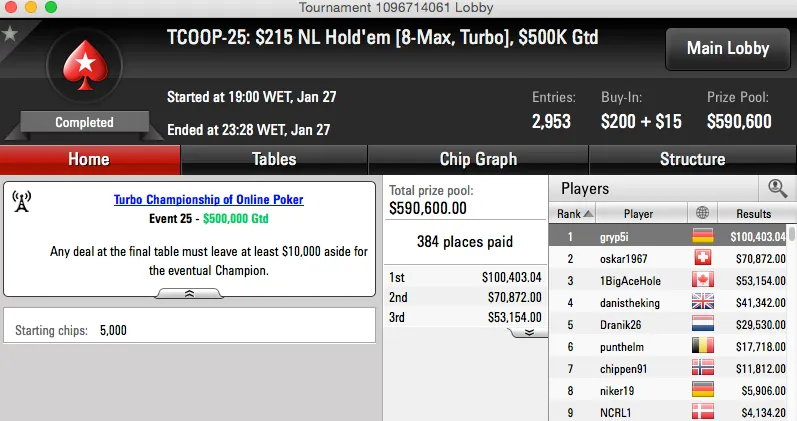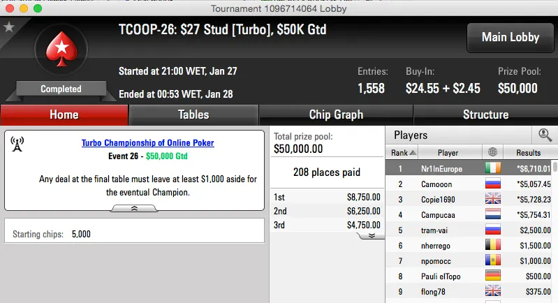 | 28 | $82.00 | TCOOP-28: $82 NL Hold'em [Turbo, Re-Entry], $250K Gtd | 28 Jan | 08:00 | $250,000* | 2 |