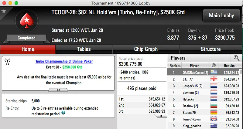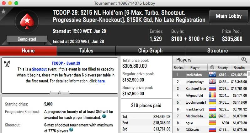 | 34 | $215.00 | TCOOP-34: $215 NL Hold'em [Turbo, Re-Entry], $600K Gtd | 29 Jan | 21:00 | $600,000* | 5 |
