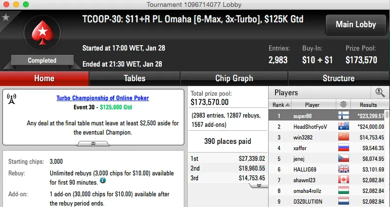 | 35 | $82.00 | TCOOP-35: $82 PL Omaha [4-Max, Turbo], $100K Gtd | 29 Jan | 23:00 | $100,000* | 3 |