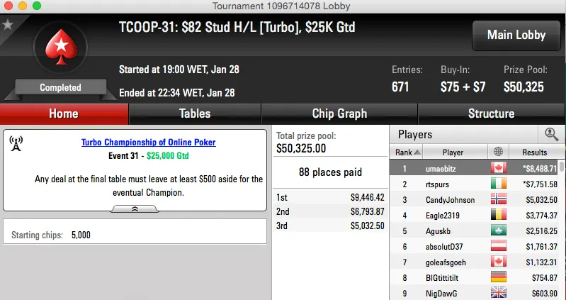 | 33 | $82.00 | TCOOP-33: $82 Razz [Turbo], $50K Gtd | 29 Jan | 19:00 | $50,000* | 1 |