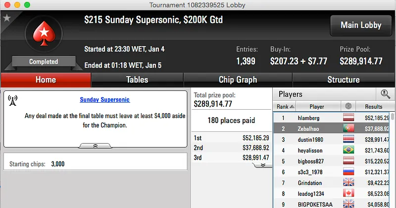 O primeiro domingo de grind de 2015 não foi nada mau, e esperemos que seja o prenúncio para um grande 2015. O maior resultado da sessão foi parar à conta de André "Zebalhao" Andrade, foi segundo no Sunday SuperSonic da PokerStars e juntou mais $37,688 à sua banca.