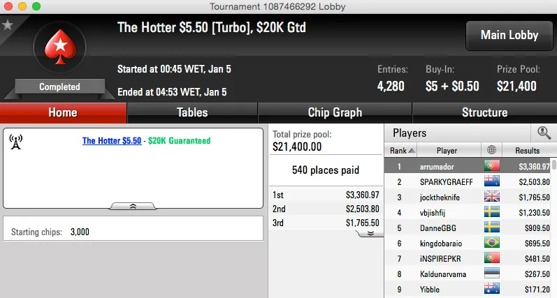 Ontem parecia que não conseguíamos melhor que o segundo lugar, assim sendo, o terceiro melhor resultado do dia foi também um segundo lugar, desta feita no The Bigger $5,50. O lusokajo_06 juntou mais $5,822 à sua banca.