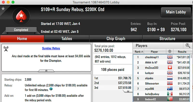 O Sunday Rebuys ou $109 Rebuys como também é conhecido, teve um luso na mesa final. Para infelicidade de liedson62 este foi o primeiro a sair e ganhou $3,893.