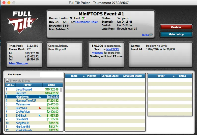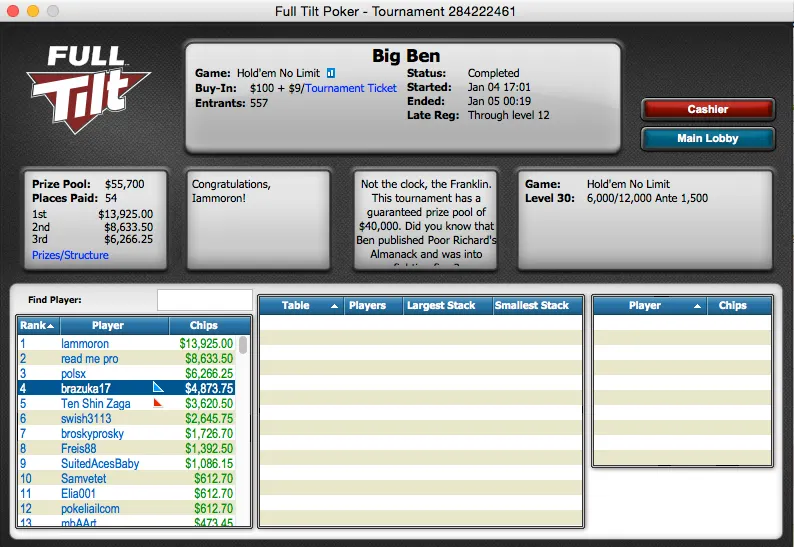 Por fim, temos a vitória de Diogo Miranda no $5,000 Guarantee da Full Tilt ($2,167).