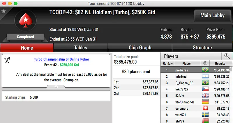 | 47 | $2,100.00 | TCOOP-47: $2,100 NL Hold'em [Turbo, High Roller], $1.25M Gtd | 01 Feb | 17:00 | $1,250,000* | 4 |