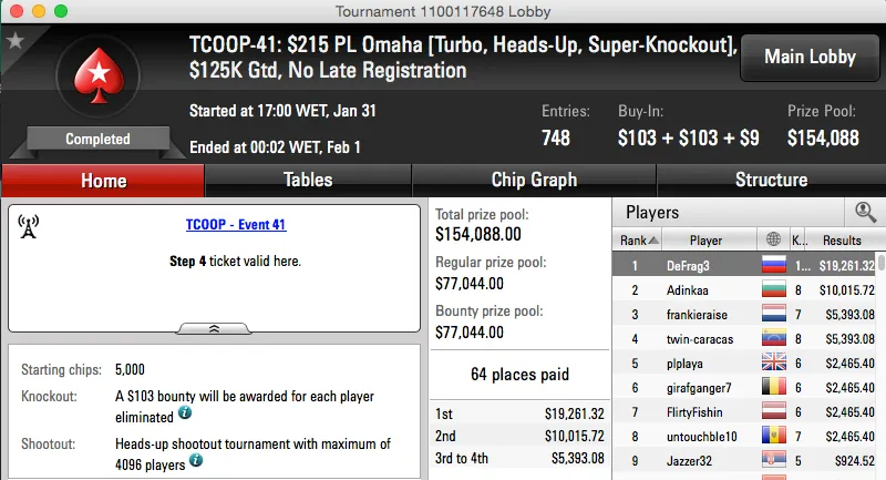 | 50 | $215.00 | TCOOP-50: $215 Sunday Supersonic TCOOP Wrap-Up [Hyper-Turbo], $500K Gtd | 01 Feb | 23:30 | $500,000* | 0 |