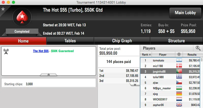 O maior foi alcançado por Pedro Faustino no The Big $55 da PokerStars. Pedro ficou no segundo lugar e recebeu $10,950.