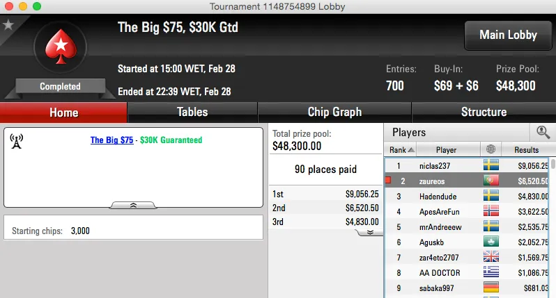O segundo resultado da noite, em termos monetários, foi o segundo lugar no The Big $75. Edgar apenas perdeu para o sueco niclas237, para Portugal vieram $6,520.