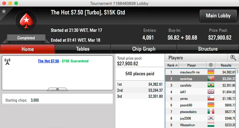 O segundo maior resultado da noite foi para um jogador que está "running hot", falo de Miguel Silva, conhecido nas mesas da PokerStars por inca7bar. Depois de ter sido segundo no The Big $8,80 apenas há uns dias atrás, Miguel volta a repetir a posição mas desta vez no The Hot $55, o prémio foi de $8,442.