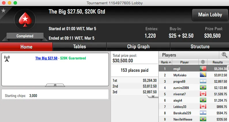 O maior resultado da sessão de ontem foi atingido já com o sol bem alto, Hugo Neves venceu há momentos o Wednesday Hundred Grand da PokerStars. O torneio estava complicado de se resolver e só um deal 3-handed fez com que "as coisas andassem", Hugo estava na liderança do torneio e garantiu a maior fatia do deal.