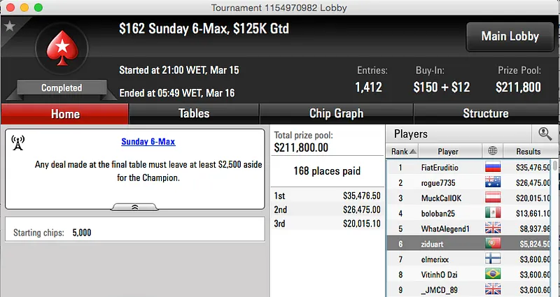 Com tanto dinheiro em jogo, seria de esperar que algum viesse parar a Portugal, e veio mesmo. O maior prémio da noite não chegou do aniversário do SM como todos desejávamos mas veio do torneio mais caro de domingo, o Sunday 500. Rui "sousinha23" Sousa foi terceiro, e sem deal juntou mais $54,757 à sua banca.