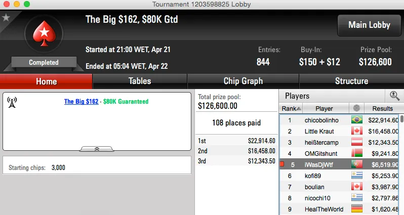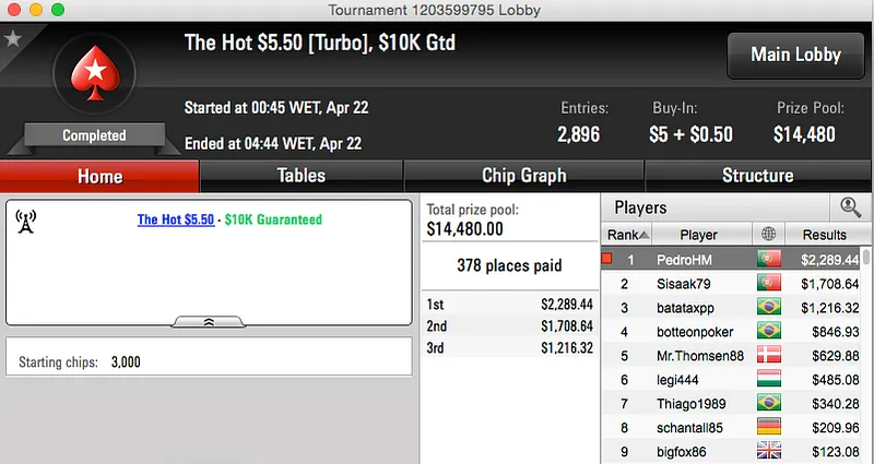 Por último temos a vitória de PedroHM no The Hot $5,50 e o segundo lugar de Sisaak79 no mesmo torneio. O field de 2,896 jogadores viu dois lusos ficarem nas primeiras posições, Pedro ganhou $2,289 e Sisaak79 ficou com $1,708.