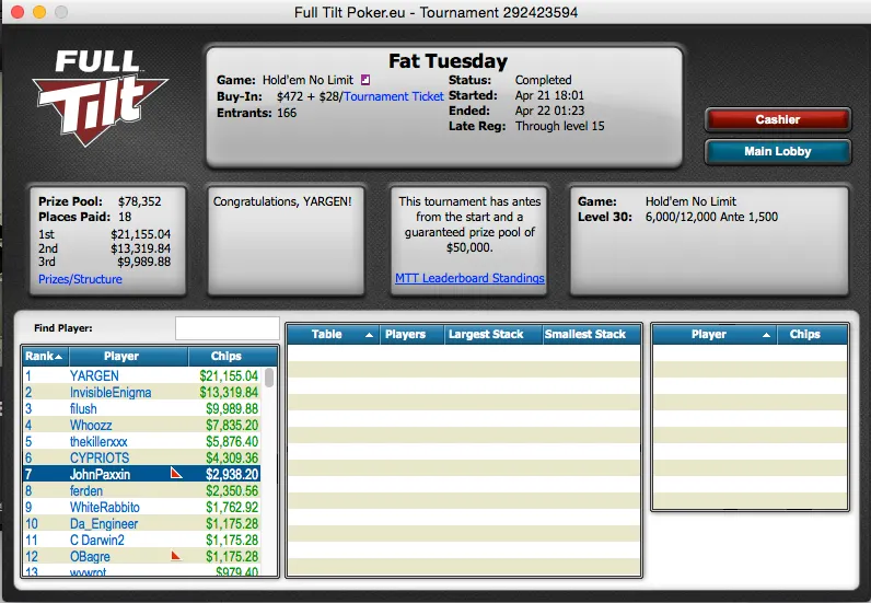 A Full Tilt estreou ontem um torneio e tivemos um português a marcar presença na mesa final. O Fat Tuesday tem $50,000 de prize pool garantido e $500 de buy-in. A sua primeira edição juntou 166 jogadores e isso fez com que o prize pool ascendesse aos $78,352. JohnPaxxin foi sétimo e recebeu $2,938.