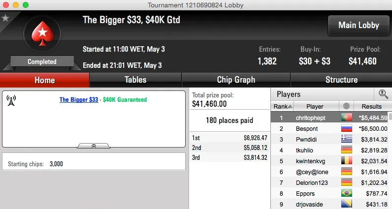 Os maiores resultados alcançados na sessão de ontem ocorreram no mesmo torneio, o Sunday Warm-Up da PokerStars. Luis Faria ficou na quinta posição ($23,350) e Jorginho Abreu foi sexto (b$17,982).