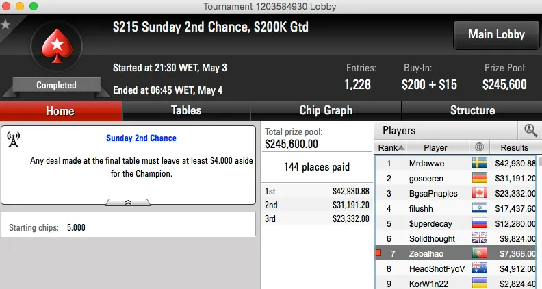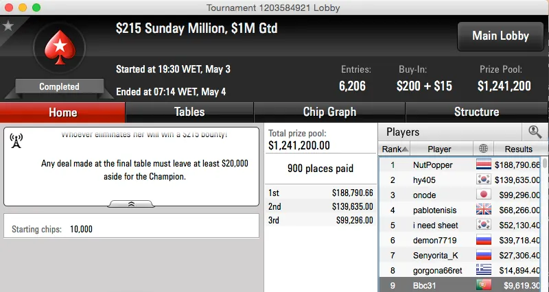 A sessão domingueira trouxe muitos resultados interessantes e a confirmação de uma presença lusa no Main Event das World Series of Poker 2015.