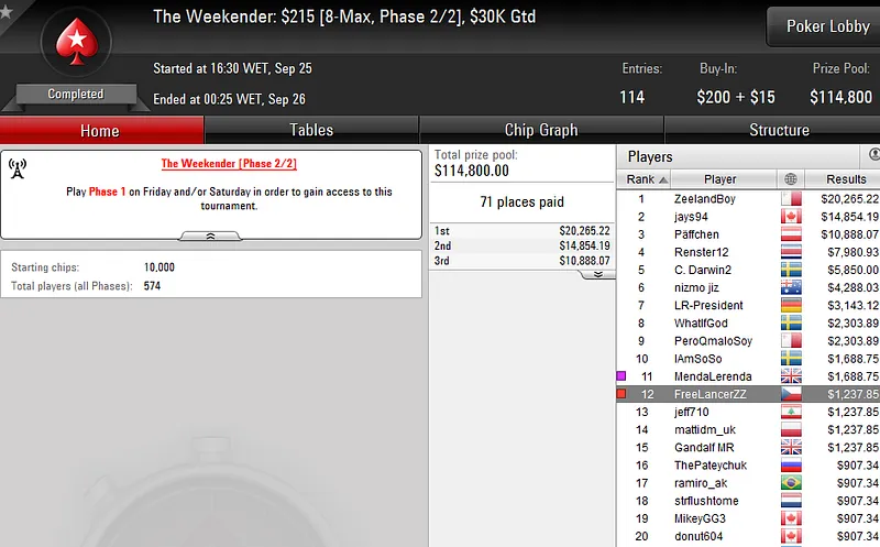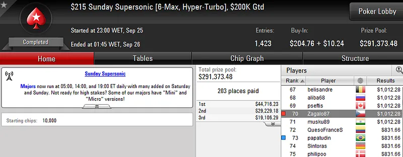 Ontem foi a vez de Filipe "Zagazaur" Oliveira brilhar no $33+R Sunday Rebuy. Este torneio contou com 1,149 entradas, 1673 rebuys e 826 add ons que perfizeram o prize pool de $109,440. Zagazaur acabou na terceira posição do pódio atrás de "ksieciunio97" e "MadsMP", e por isso recebeu $9,108 de prémio.