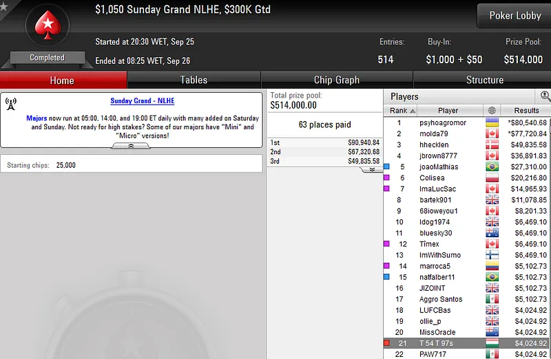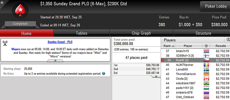 No poker online, domingo é dia de grind e tal como prevíamos este não foi diferente. Apesar do WCOOP ocupar grande parte das atenções durante as ultimas semanas, os torneios regulares também trazem bons prémios para os nossos jogadores emigrados.