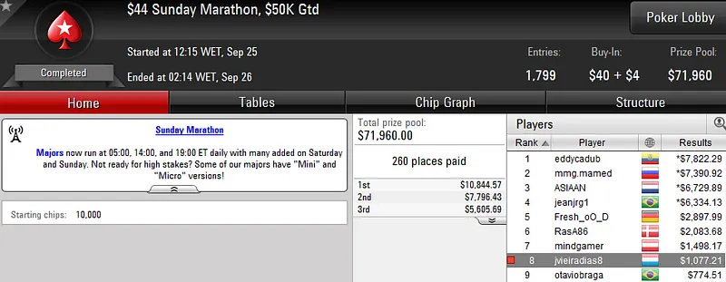 Já Julio "julioassp" Ribeiro não precisou de chegar tão longe para somar um bom resultado. O jogador luso terminou o $700 Super Sized Sunday com 1,039 participantes na 51ª posição e recebeu $1,313 de prémio. E ainda mostrou ser um verdadeiro sniper ao acrescentar $3,449 em bounties.