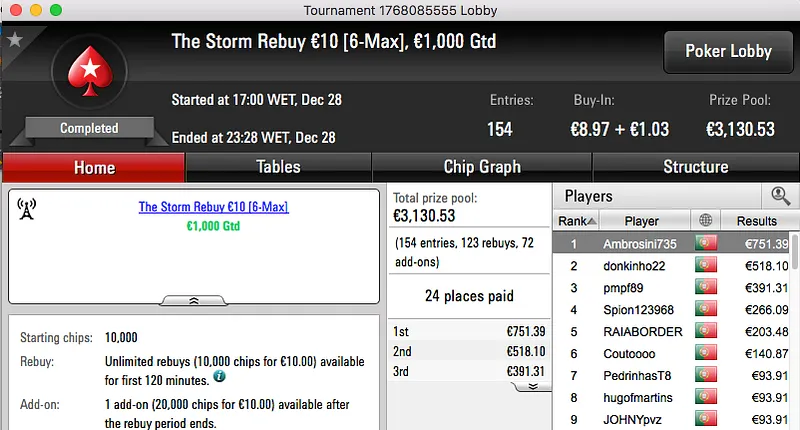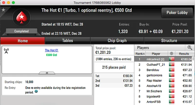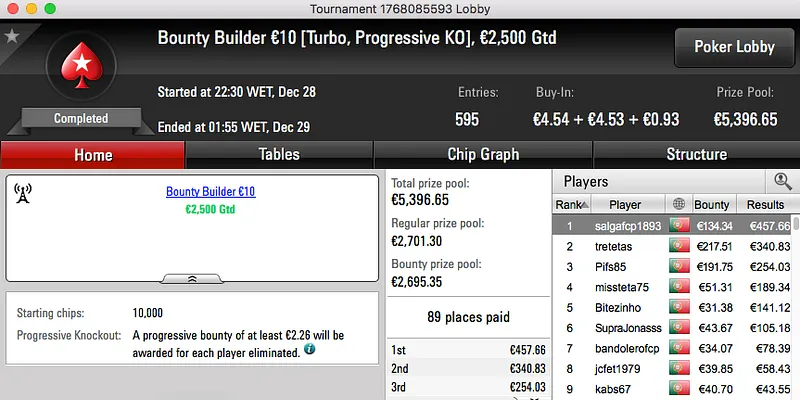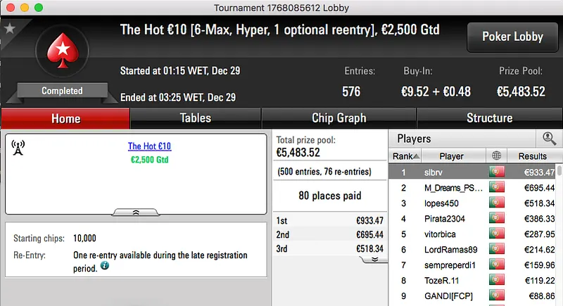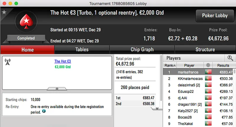 O pódio dos maiores prémios fecha com a vitória de JMBG0987 no The Hot BigStack Turbo €50, rendeu €1,729.