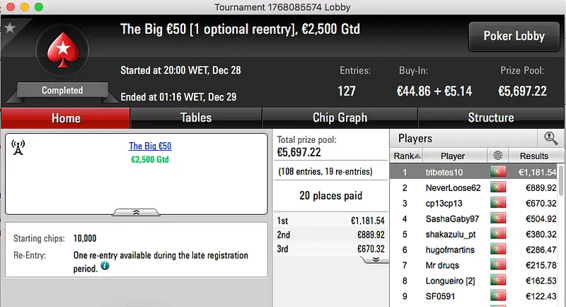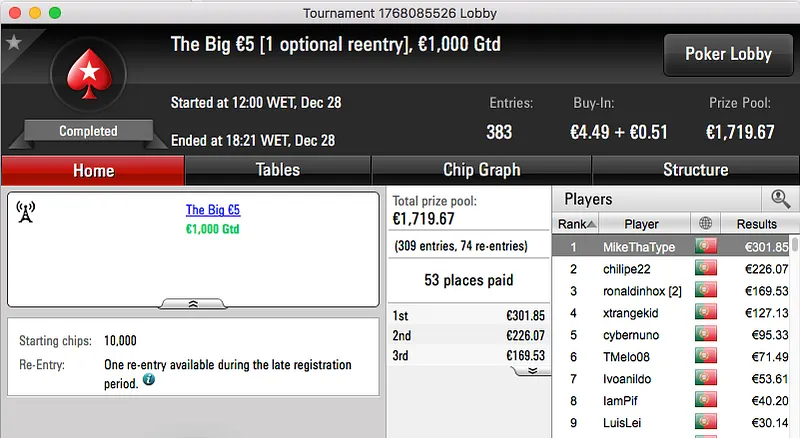 O The Big €100 da PokerStars.pt voltou a atribuir os dois maiores prémio da noite. O torneio de ontem contou com 85 jogadores em prova e o prize pool a distribuir ascendeu aos €7,705, a maior fatia foi parar à conta de Cuco1906 (€1,810) que bateu pasmasseiro (€1,390) em heads-up.