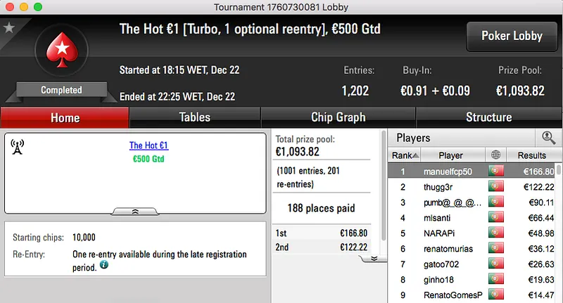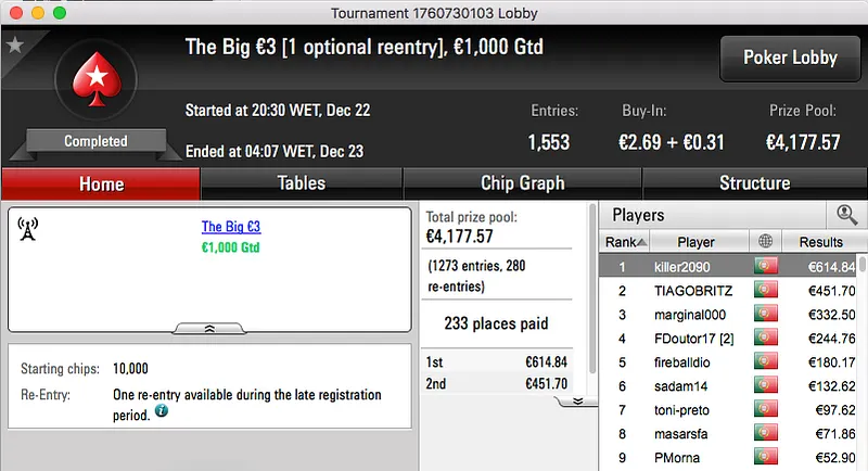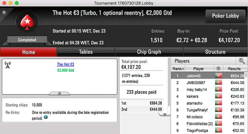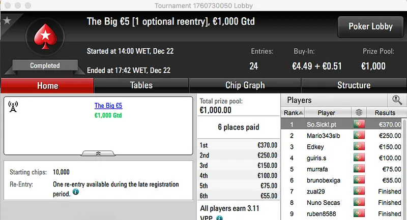 A sessão de quinta-feira terminou com Pedro Feijó a somar o maior prémio do dia da PokerStars.pt. Feijó (€1,653) bateu Montjak (€1,140) no heads-up e juntou esta vitória no Hot BigStack Turbo ao sétimo lugar obtido no The Big €100.