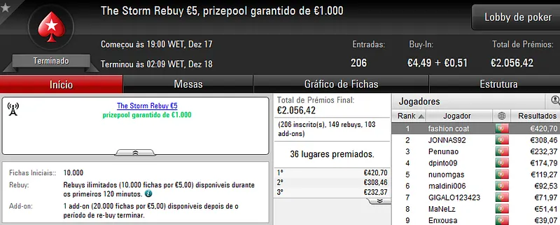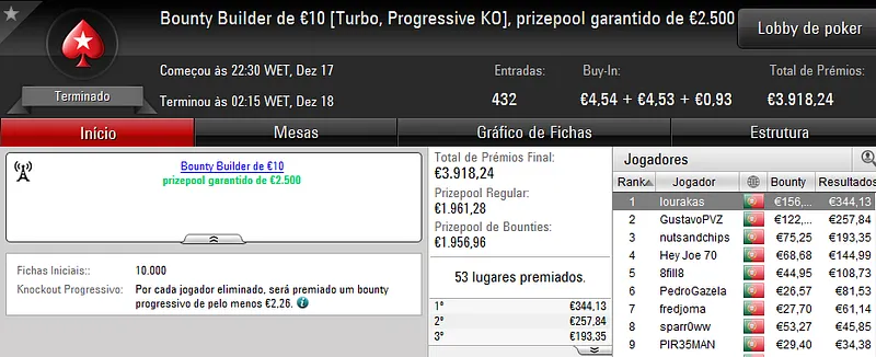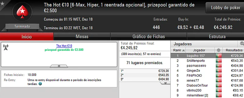 Já no The Hot Big Stack Turbo €50 com 93 entradas e €4,215 de prize pool, "OldSirBluff" saiu vitorioso e arrecadou 1,096 de prémio.