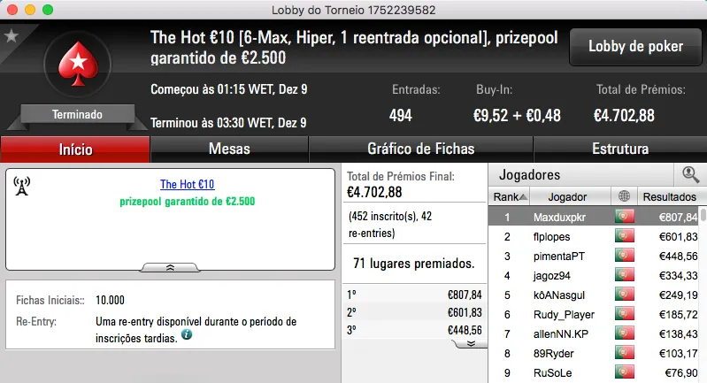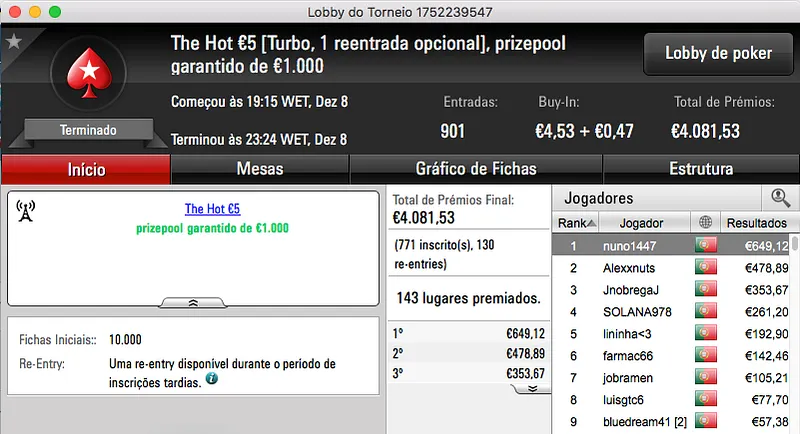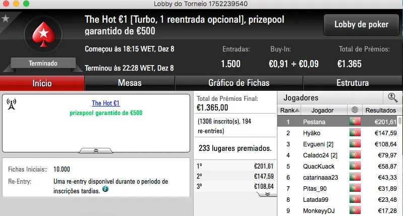 O segundo maior prémio da noite foi entregue, como tem sido costume, no The Hot BigStack Turbo €50. Os 132 jogadores presentes amealharam um prize pool de €5.983 e isso fez com que o vencedor, onliness, recebesse €1.436.