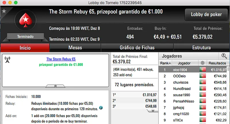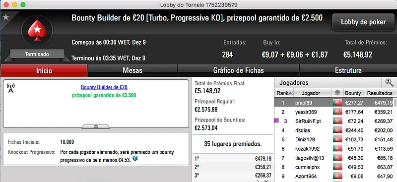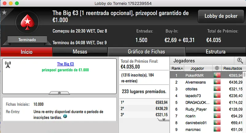 Em terceiro aparece Marco "TiJoao" Dias, bateu um field de 147 jogadores no The Big €50 e recebeu €1.287.