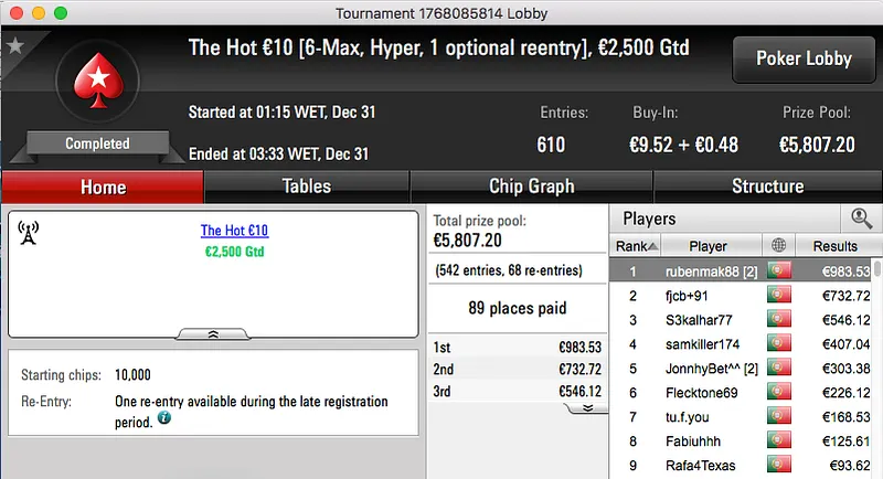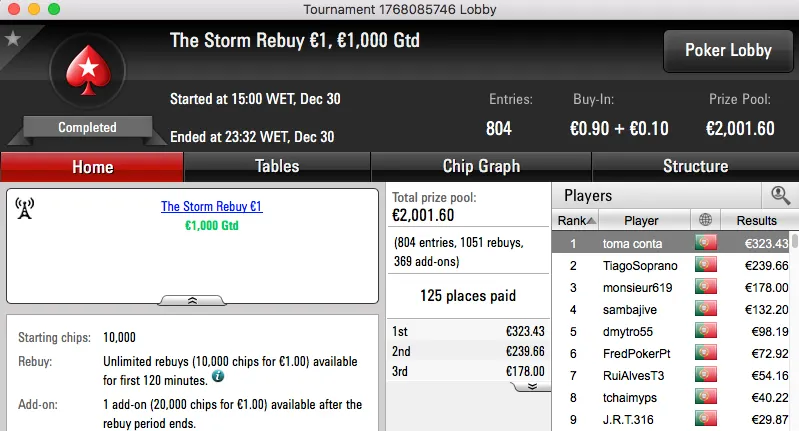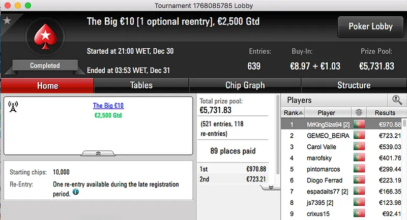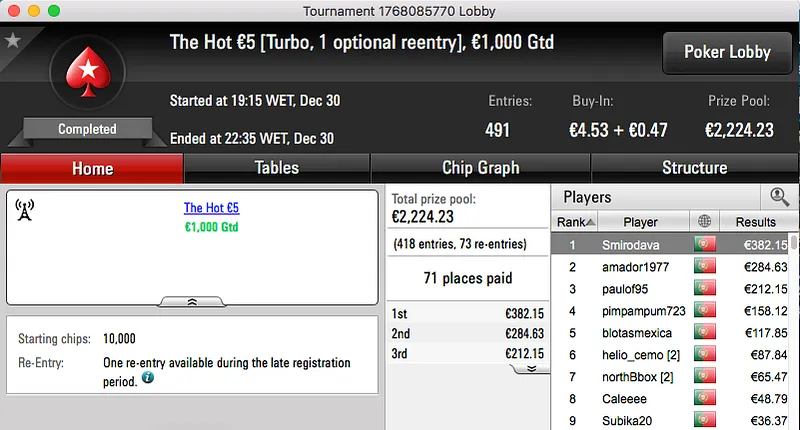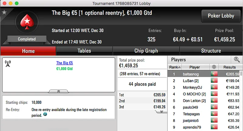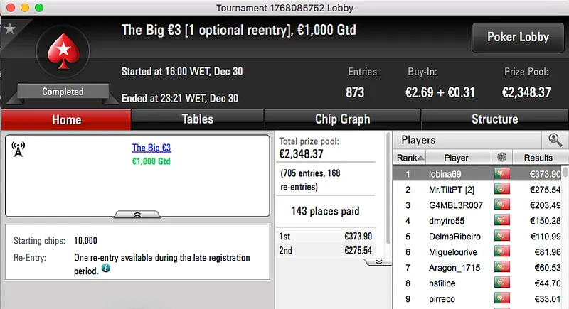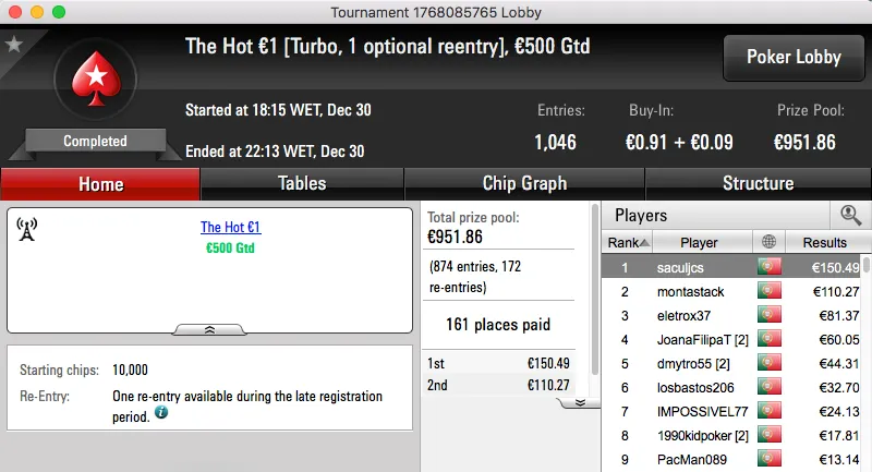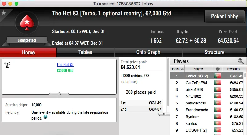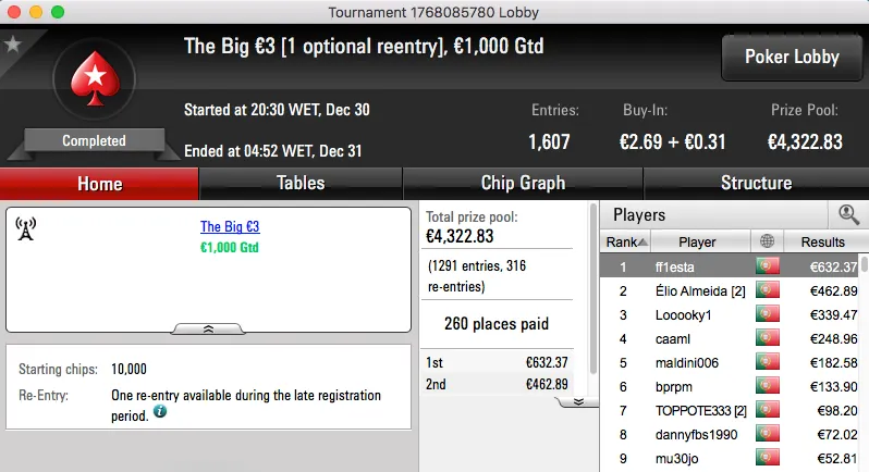 A penúltimo sessão de 2016 terminou com titanjanu a ficar com o maior prémio entregue. A vitória sobre Bruno "BrPe" Pedrosa (€1,489) no heads-up do The Big €100 rendeu €1,938.