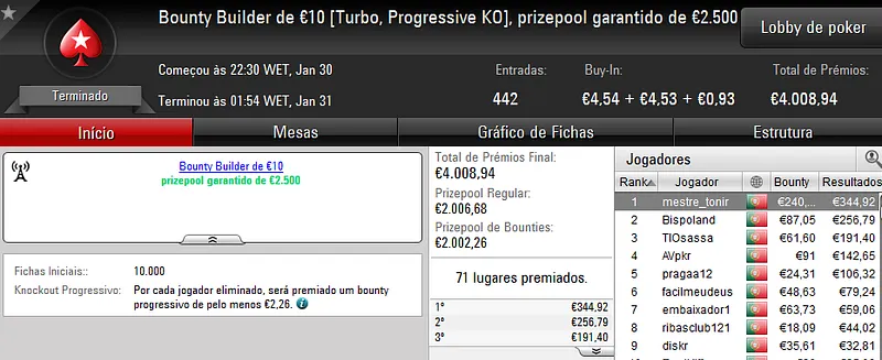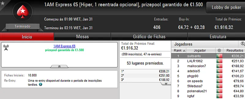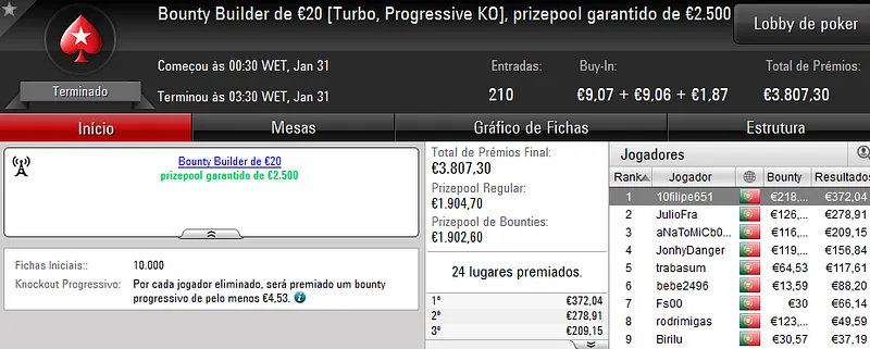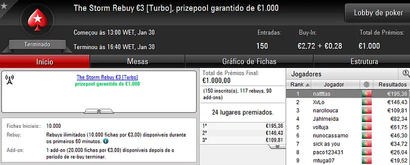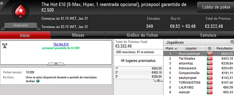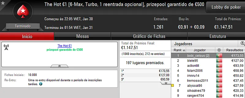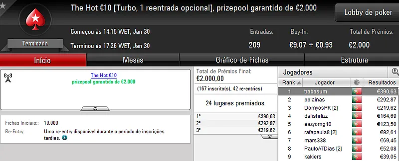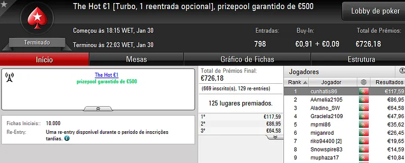 O The Hot BigStack Turbo €50 contou com 146 entradas que perfizeram €6,618 de prize pool. Os grandes vencedores foram "amlfaria" (€1,588) e "tiagosnts" (€1,095) que disputaram o heads up.