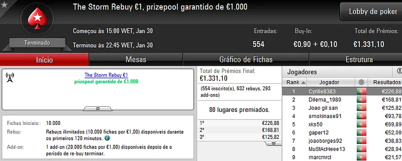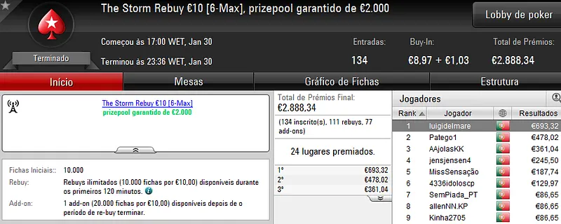 Ontem terminaram o Sunday Storm €10 e o Sunday Special €100 que agora são disputados em dois dias, mas também contamos com uma sessão bem concorrida na PokerStars.pt. A novidade, porém, foi a introdução do torneio The Big €20 no calendário da sala.